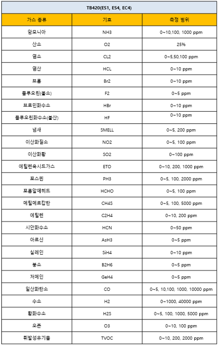 ## 측정 가스 종류 및 측정 범위