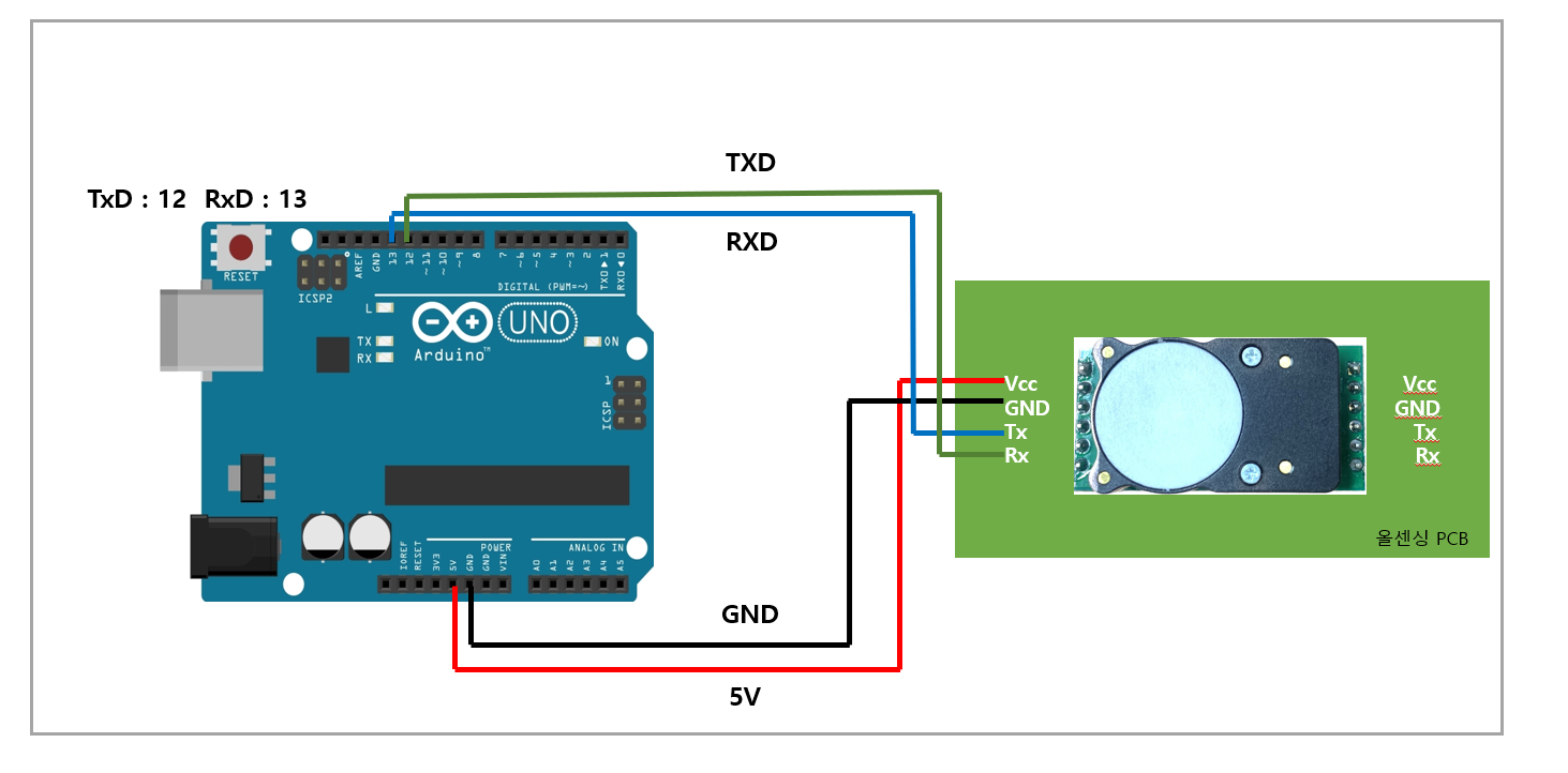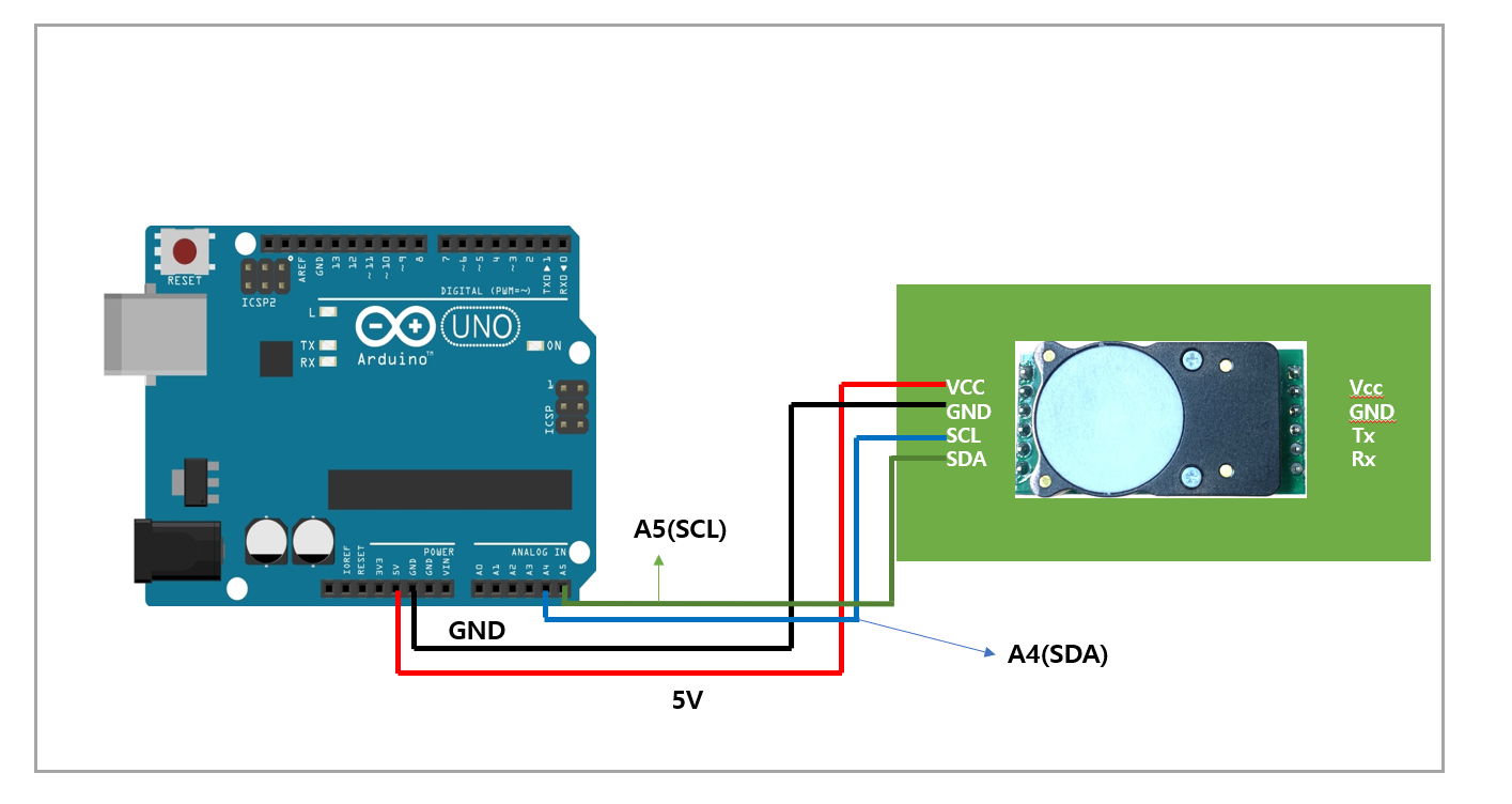 <table><thead><tr><th width="140" align="center">항목</th><th align="center">Arduino Uno</th><th align="center">Cozir-LP2</th></tr></thead><tbody><tr><td align="center">VCC</td><td align="center">5V or 3.3V</td><td align="center">VCC</td></tr><tr><td align="center">GND</td><td align="center">GND</td><td align="center">GND</td></tr><tr><td align="center">TX</td><td align="center">A5</td><td align="center">SCL</td></tr><tr><td align="center">RX</td><td align="center">A4</td><td align="center">SDA</td></tr></tbody></table>