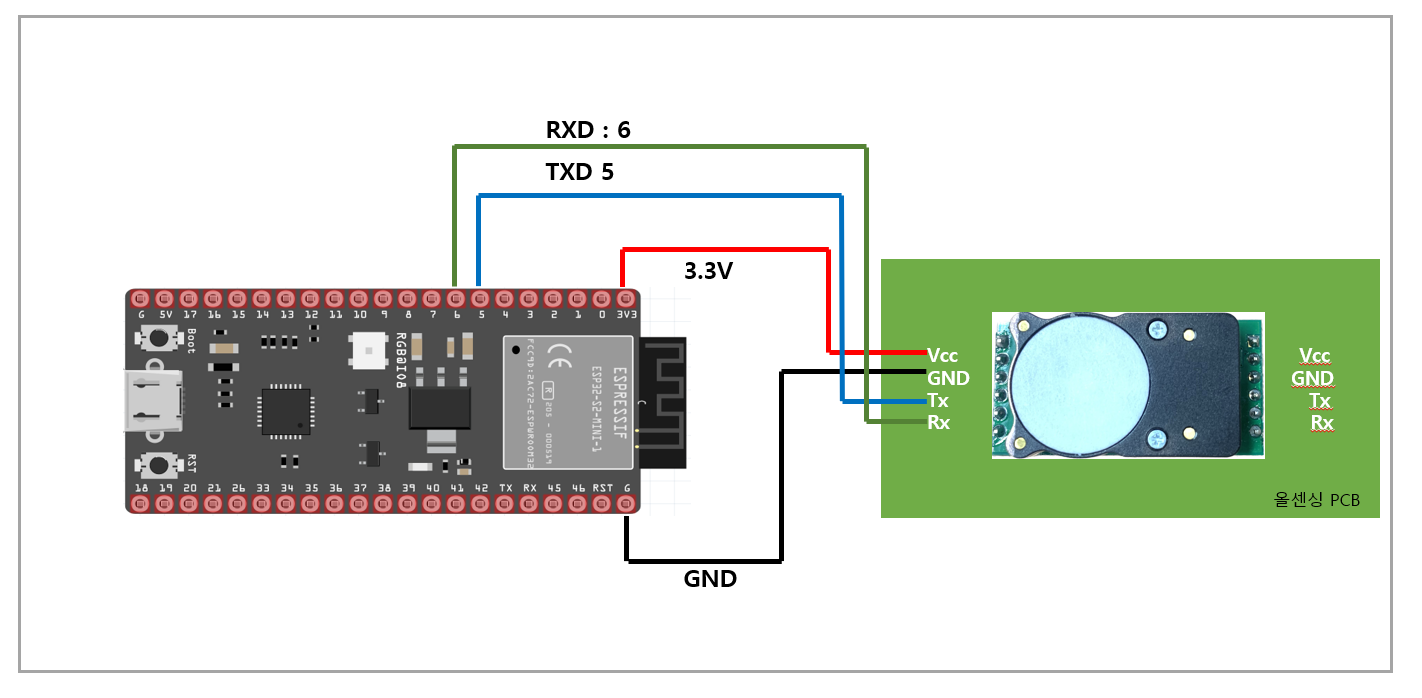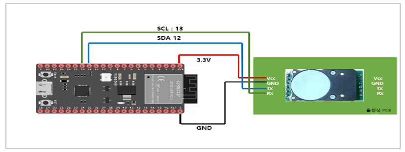 <table><thead><tr><th width="140" align="center">항목</th><th align="center">ESP32</th><th align="center">Cozir-LP2</th></tr></thead><tbody><tr><td align="center">VCC</td><td align="center">5V or 3.3V</td><td align="center">VCC</td></tr><tr><td align="center">GND</td><td align="center">GND</td><td align="center">GND</td></tr><tr><td align="center">TX</td><td align="center">13</td><td align="center">SCL</td></tr><tr><td align="center">RX</td><td align="center">12</td><td align="center">SDA</td></tr></tbody></table>