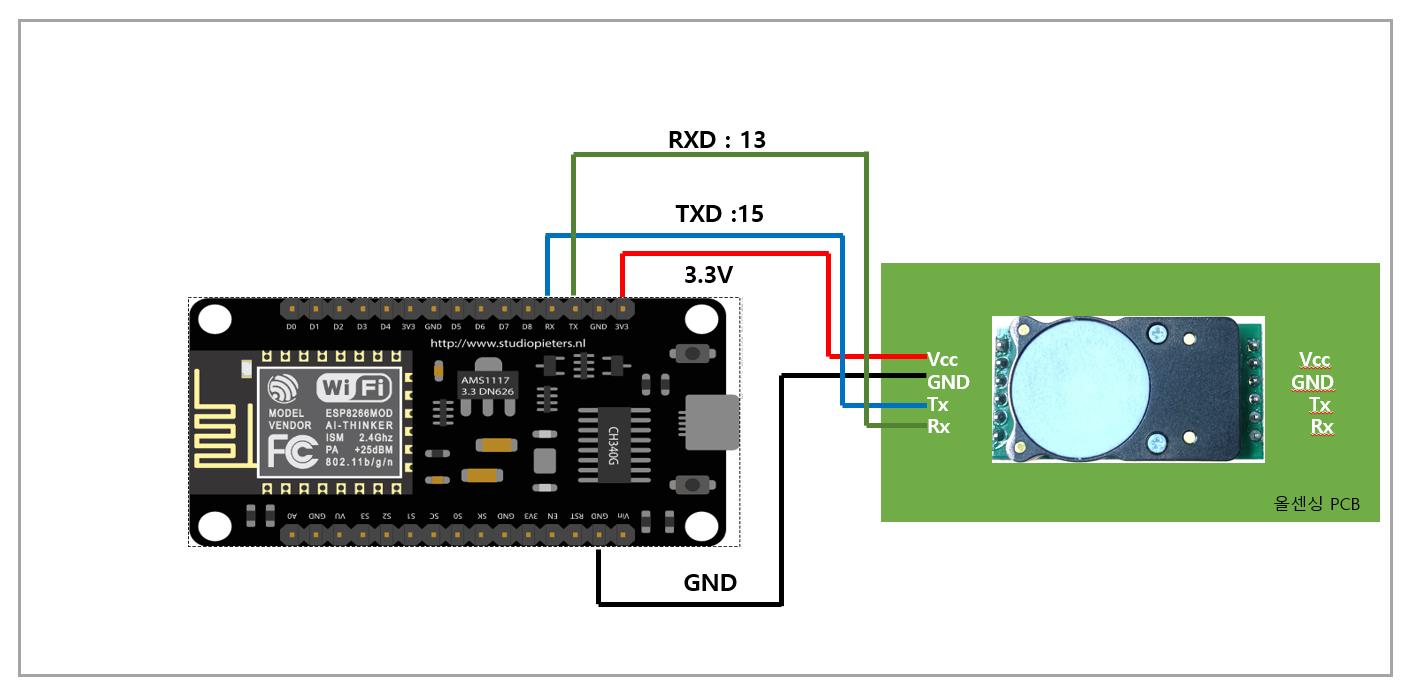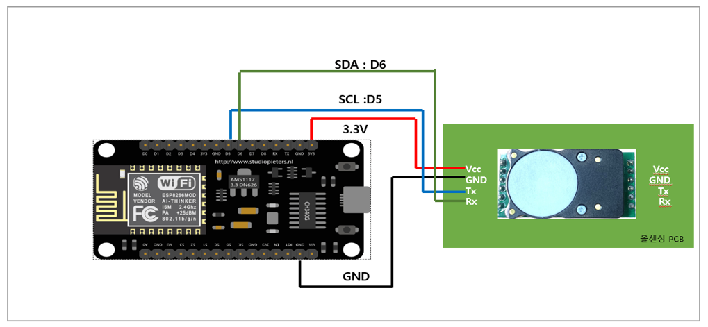 <table><thead><tr><th width="140" align="center">항목</th><th align="center">ESP8266</th><th align="center">Cozir-LP2</th></tr></thead><tbody><tr><td align="center">VCC</td><td align="center">5V or 3.3V</td><td align="center">VCC</td></tr><tr><td align="center">GND</td><td align="center">GND</td><td align="center">GND</td></tr><tr><td align="center">TX</td><td align="center">D5</td><td align="center">SCL</td></tr><tr><td align="center">RX</td><td align="center">D6</td><td align="center">SDA</td></tr></tbody></table>