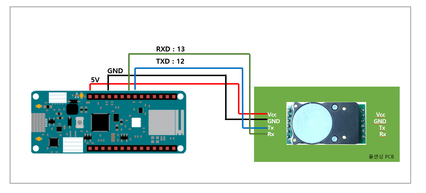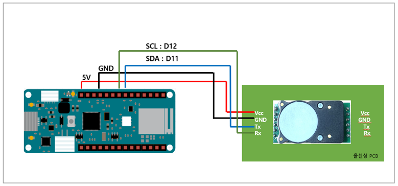 <table><thead><tr><th width="140" align="center">항목</th><th align="center">Arduino MKR</th><th align="center">Cozir-LP2</th></tr></thead><tbody><tr><td align="center">VCC</td><td align="center">5V or 3.3V</td><td align="center">VCC</td></tr><tr><td align="center">GND</td><td align="center">GND</td><td align="center">GND</td></tr><tr><td align="center">TX</td><td align="center">D11</td><td align="center">SCL</td></tr><tr><td align="center">RX</td><td align="center">D12</td><td align="center">SDA</td></tr></tbody></table>