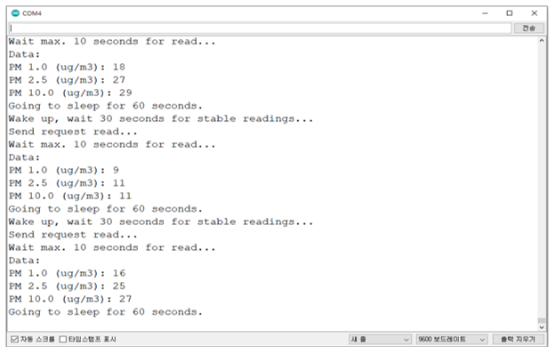 {% tab title="Passive mode에서 미세먼지 농도 읽기(Sleep, wake up)" %}