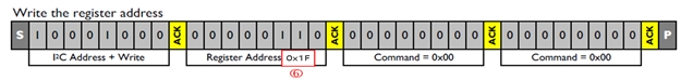 Device에서 Command ((i2c Address+Write bit),0x1F(ID 하위 바이트), 0x00, 0x00)를 ETH-01D로 전송 후 120 μs 기다림